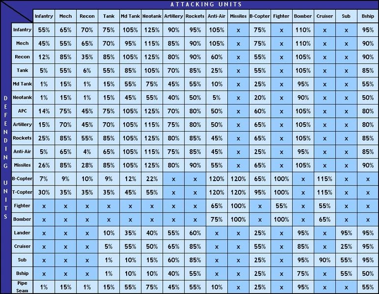 The charts below display the percentage of damage dealt between two units head-to-head. All the following results assume that no CO bonuses and terrain defenses are in play.
