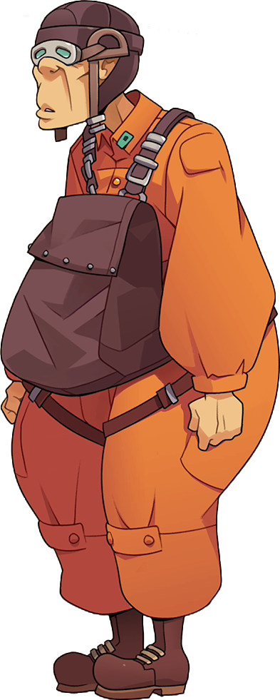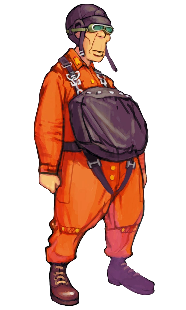 Sensei is an elderly paratrooper wearing an orange jumpsuit and a brown helmet with aviator goggles. He has a parachute pack attached to the front of his body, held in place by many buckles. Sensei also wears brown shoes and has some sort of green insignia on his collar.